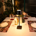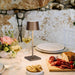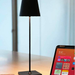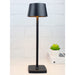Lampada moderna da tavolo a LED con batteria ricaricabile, con base e corpo in alluminio, diffusore in policarbonato, finitura grigio scuro. Ottima sopra un tavolo durante una cena all'aperto. Grado protettivo: IP65 (completamente stagna, per interni ed esterni). Durata della batteria 6 ore.