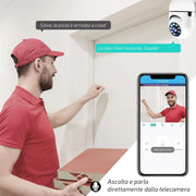 Rsoluzione HD 1080p, la nostra telecamera di sicurezza domestica wireless WiFi offre un eccellente video live e cristallino durante e una visione panoramica a 360° con vista a uccelli.